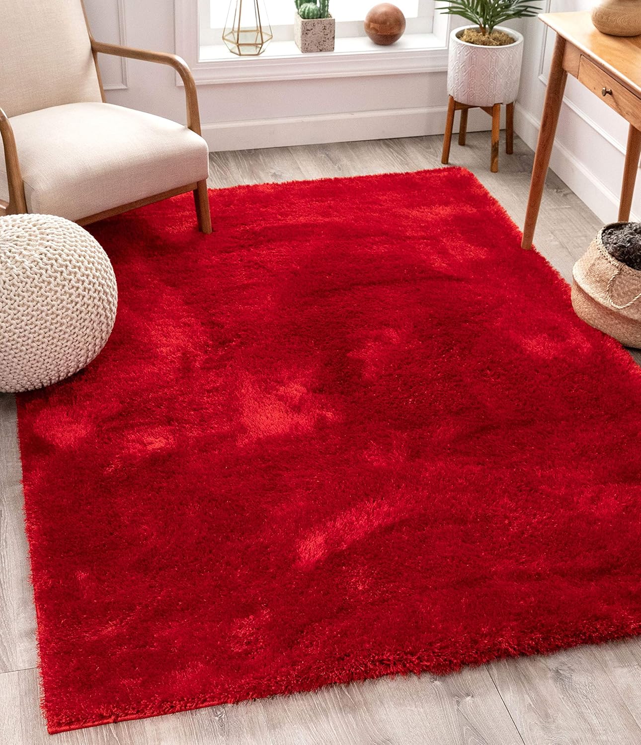 Amazon Com Shimmer Shag Bright Red Solid Plain Modern Luster Ultra Thick Soft Plush 8x10 7 10 X 9 10 Area Rug Contemporary Retro Polyester Textured Two Length 2 Pile Yarn Easy Clean Stain Fade