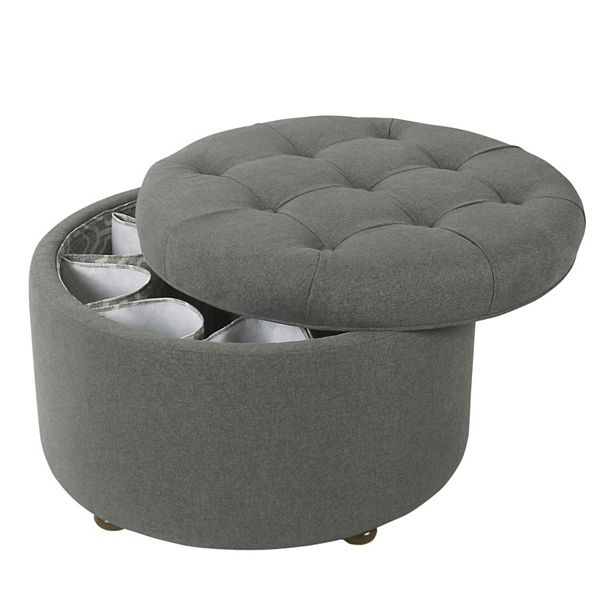 Dress up your bedroom living room or closet with a luxurious tufted ottoman every shoe lover will adore. Description Say shoo to clutter with the Augusta shoe storage ottoman which does double time as a comfortably upholstered bench. Especially designed to neatly store shoes this space-saving ottoman has room for purses belts and more.