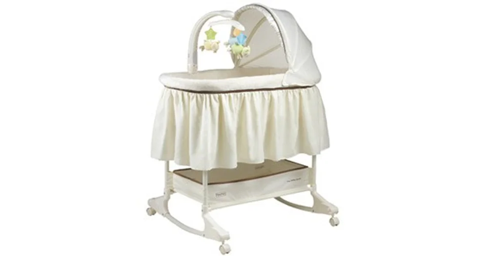 - Rocks with a gentle push from you. Offering a gliding motion at a speed thats just right along with music nature sounds and simulated sounds of the womb this bassinet strikes a harmonious balance between beauty and function for both you and your baby. 49 out of 5 stars with 82 reviews.
